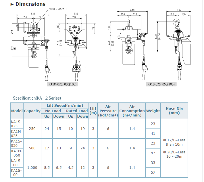 KA1型气动葫芦,分为KA1S固定式气动葫芦、KA1M运行式气动葫芦两种是韩国KHC品牌气动葫芦,防爆性能好,被广泛地应用在化工、纺织、喷漆、物流、码头等易燃、易爆、高温、高粉尘、腐蚀性强的作业场所。